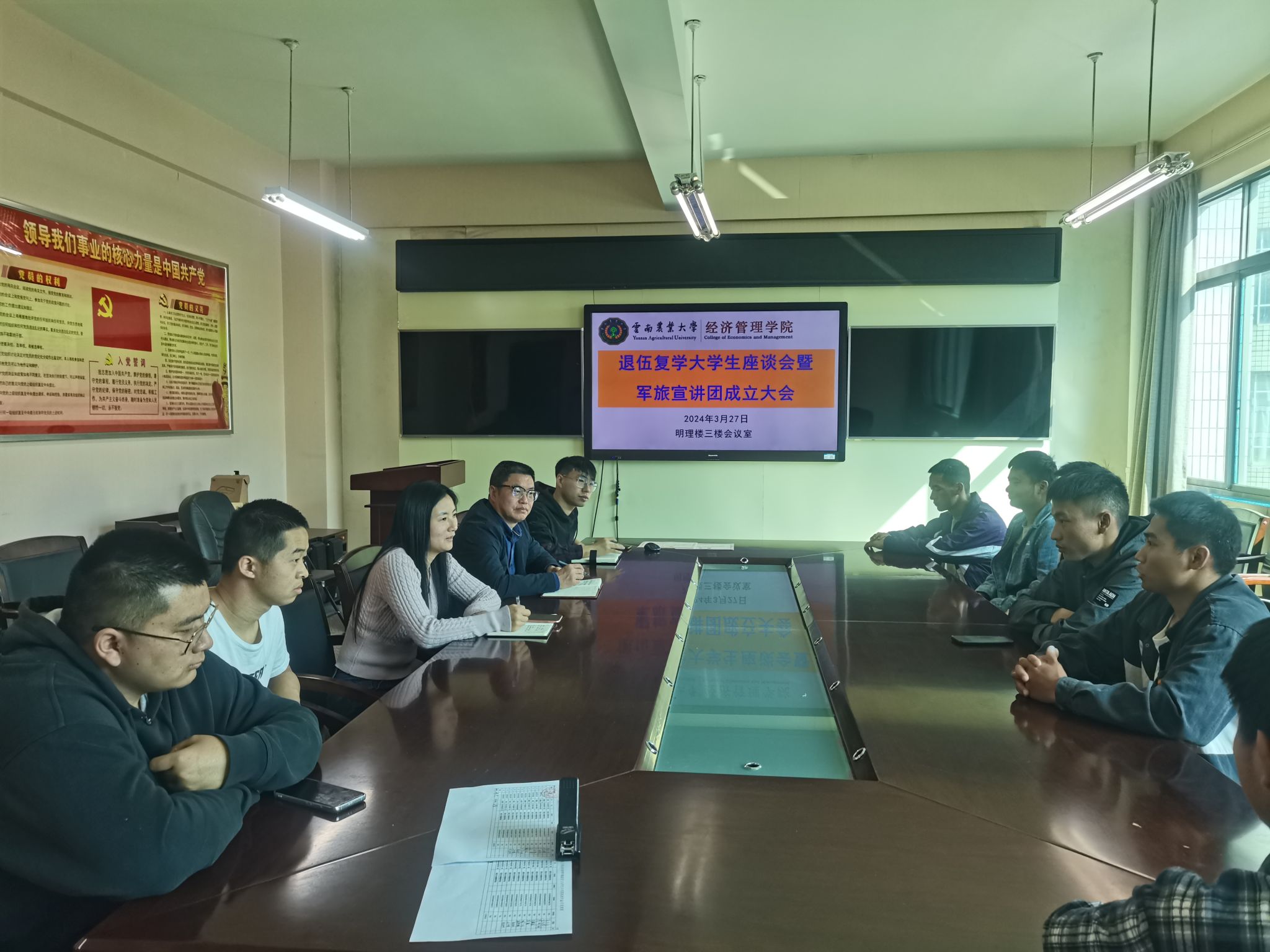 为进一步增强退役复学员工荣誉感、归属感,切实关心关爱退役复学员工,发挥退役复学员工参军入伍示范引领作用,广泛宣传动员员工携笔从戎、参军报国,3月27日,公司在明理楼3楼会议室举办退伍复学员工座谈会暨青年退伍员工军旅宣讲团成立大会。公司党委书记李文荣出席会议并讲话,公司党委副书记马蓉主持会议,公司团委老师、退役复学员工及有参军入伍意向的员工代表参加会议。