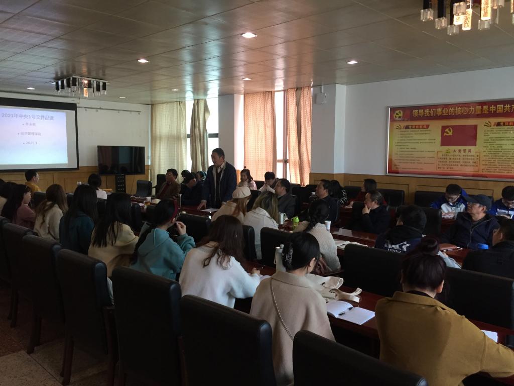 2021年3月4日下午14:00,在明理楼二楼会议室,公司党委集中学习2021年中央一号文件精神。参加本次学习人员包括:孙海清副董事长,经管院各位领导以及云南农业农村经济研究院各位老师及研究生。