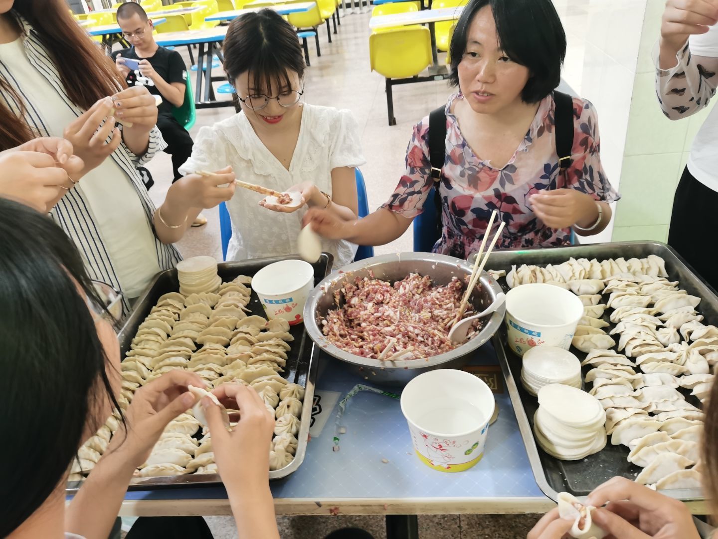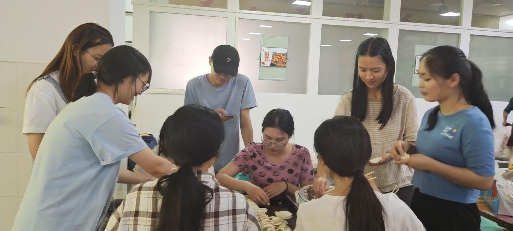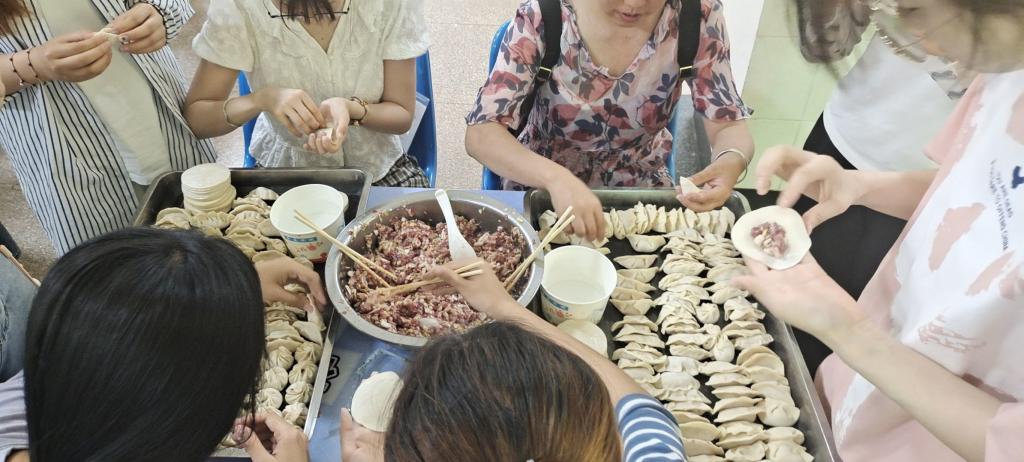 下午一点半,同学们齐聚食堂。首先进行的是包饺子的前期准备,同学们分工合作,清洗食材、制作馅料、调蘸料一气呵成;之后便开始包饺子,同学们三五个为一小组围坐在桌前,互相探讨包饺子的技巧与方法,在欢声笑语中,盘子里已装满了饺子。在经过食堂阿姨的烹煮后,热腾腾的饺子就出锅了,同学们拿起自己的蘸料碗迫不及待地想要品尝自己劳动果实,饺子的香味在空气中氤氲,同学们的热情也随之升温。吃完饺子,全班同学在食堂里进行合影留念。