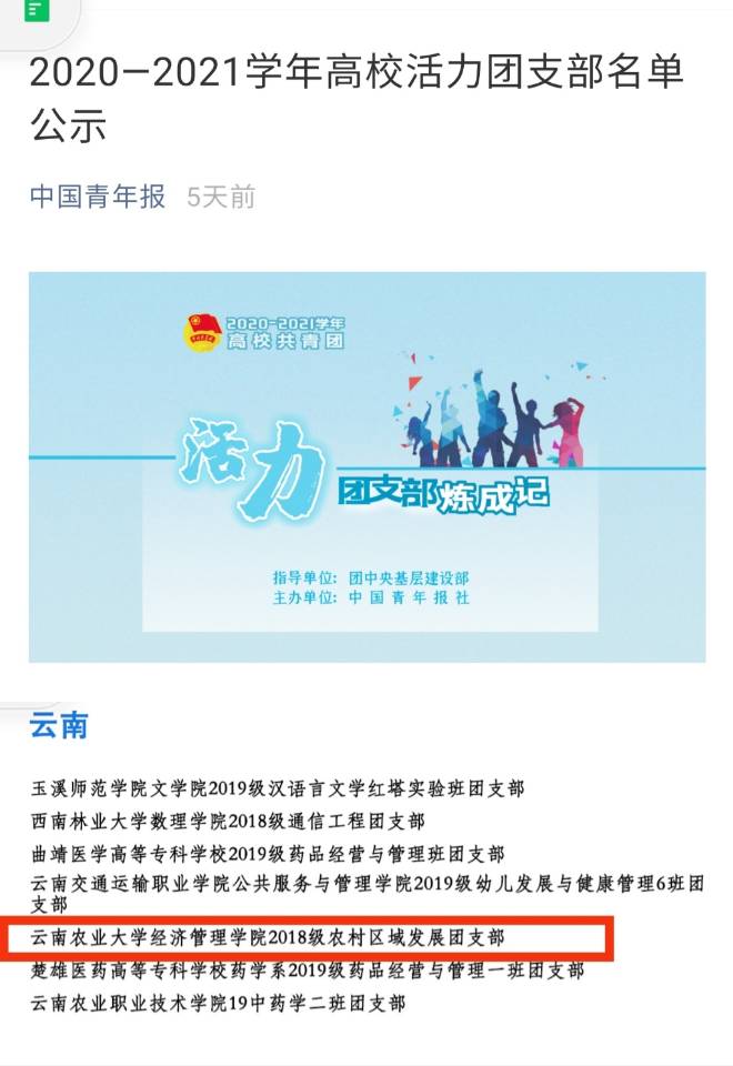 为深入贯彻落实“全团大抓基层”“全团抓公司”部署,深化高校共青团改革,强化“一切工作到支部”理念。中国青年报社开展“活力团支部练成记”2020-2021学年高校活力团支部遴选及展示活动,经校级申报、省级初评、全国终审、展示风采点赞等环节,2018农村区域发展团支部,获得“2020-2021学年高校活力团支部”的荣誉。