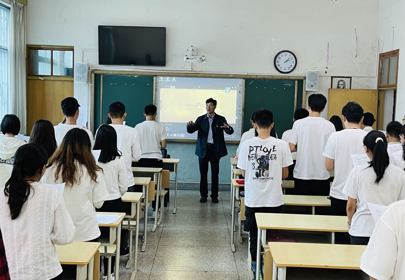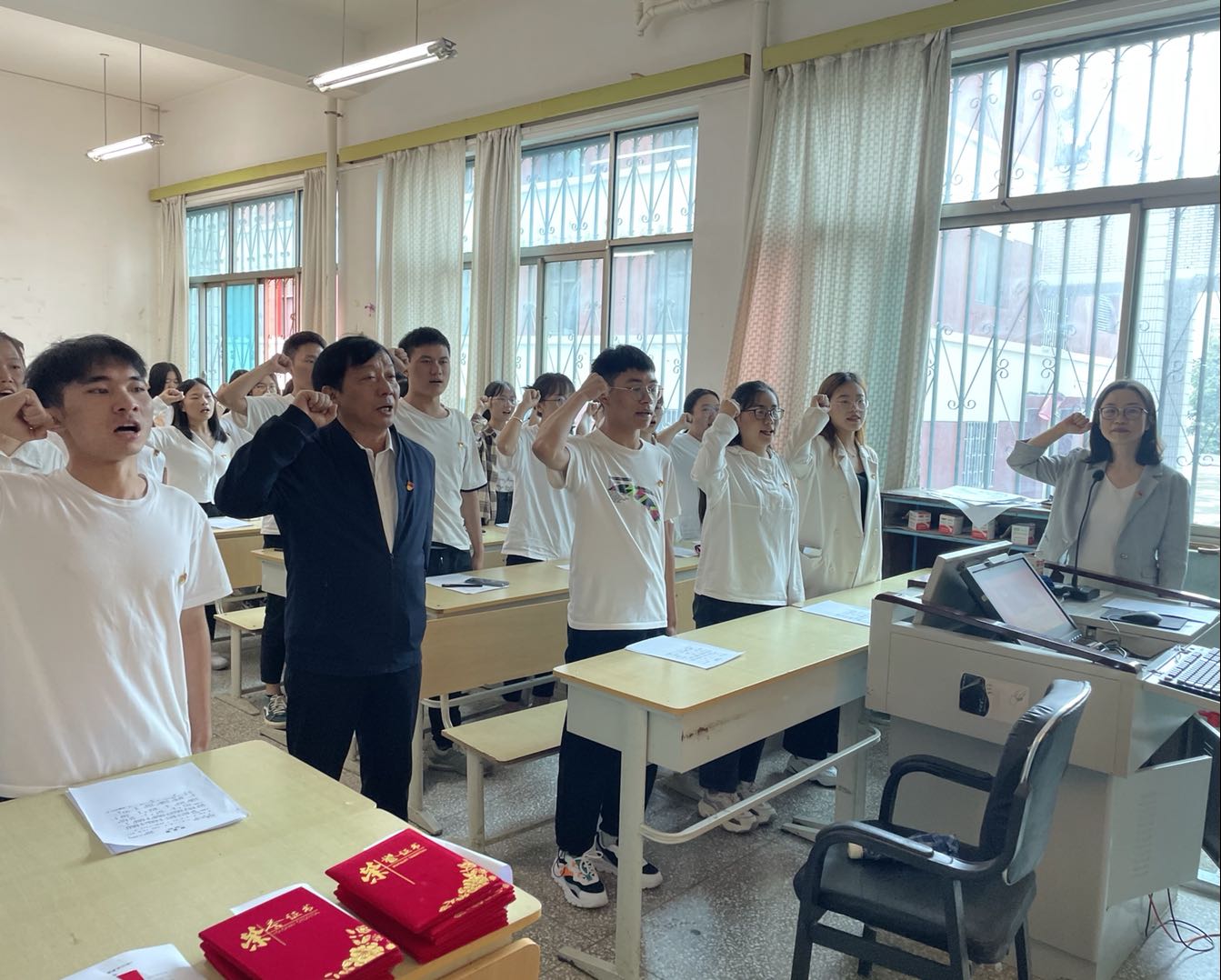 观看建党100周年直播大会结束后,陈蕊副书记领誓,39名新党员和三十余名老党员共同重温了入党誓词。随着铿锵有力的宣誓声,用誓言作出了共产党员的郑重承诺,深刻铭记自己所肩负的使命和职责。随后杨建荣组织员带领参加活动的师生齐唱入党誓词歌,“我志愿加入中国共产党,拥护党的纲领,遵守党的章程,履行党员义务……”荡气回肠的旋律在126教室唱响,唱出了豪情、唱出了精神、唱出了动力,慷慨激昂的歌词,点燃了现场每一位党员的激情壮志。