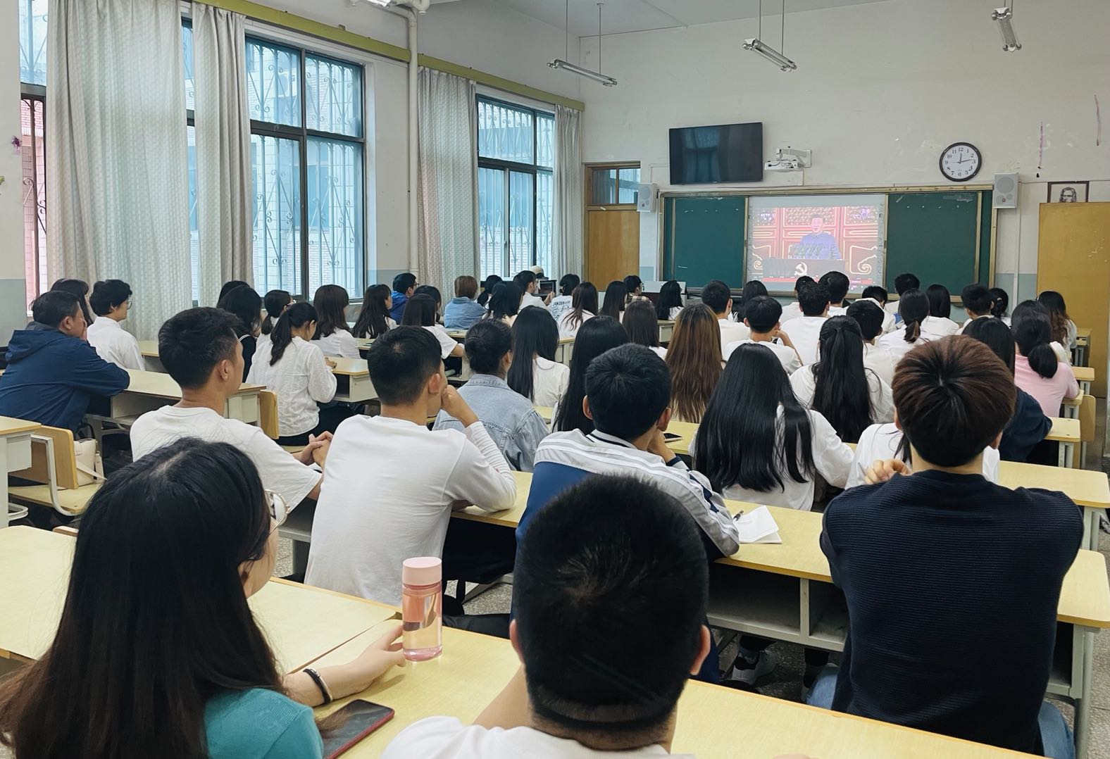 早上8时随着阵阵礼炮轰鸣和各仪仗队的铿锵脚步,庆祝中国共产党成立一百周年大会在北京天安门广场举行。师生们被现场的氛围所感染,整个观看过程情绪高涨,为祖国的伟大成就而自豪,也为党的百年诞辰而喜悦。建党百年,所有的感动,所有的敬意都汇聚成总书记的几句话语,“伟大、光荣、正确的中国共产党万岁!伟大、光荣、英雄的中国人民万岁!”