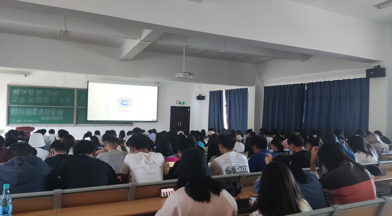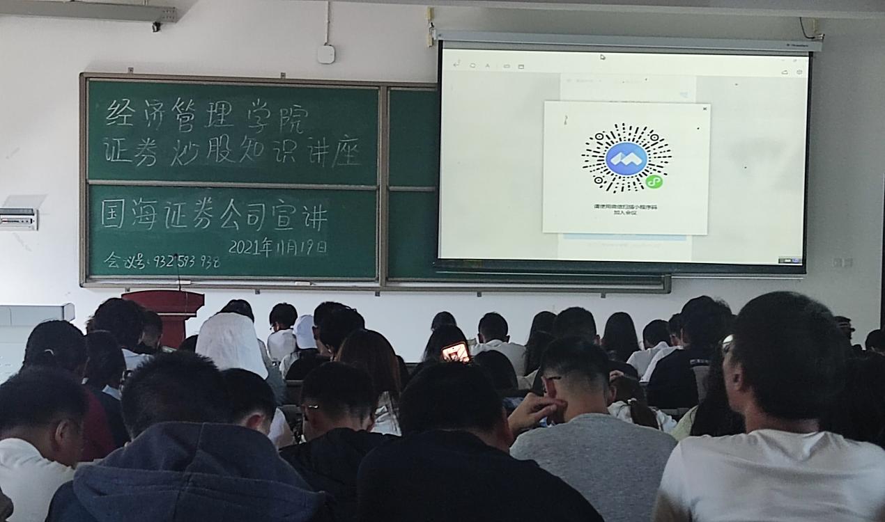 本次活动由公司李永前老师组织开展、国海证券公司的姚航老师主讲,采用“线上+线下”的模式为新生讲述证券炒股的相关知识,既提高了讲座宣讲的效率,又符合疫情防控要求。姚老师根据证券投资的特色对股票做了具体而生动的介绍,包括认识什么是股票、股票的分类、股票的交易规则、怎么去看盘面以及股票的分析方法;同时,结合当前形势分析证券交易的就业前景和发展方向,要求员工具备的良好职业素质等,使同学们对证券投资有了全新的认识,也为以后更好地学习相关知识奠定了良好的基础。