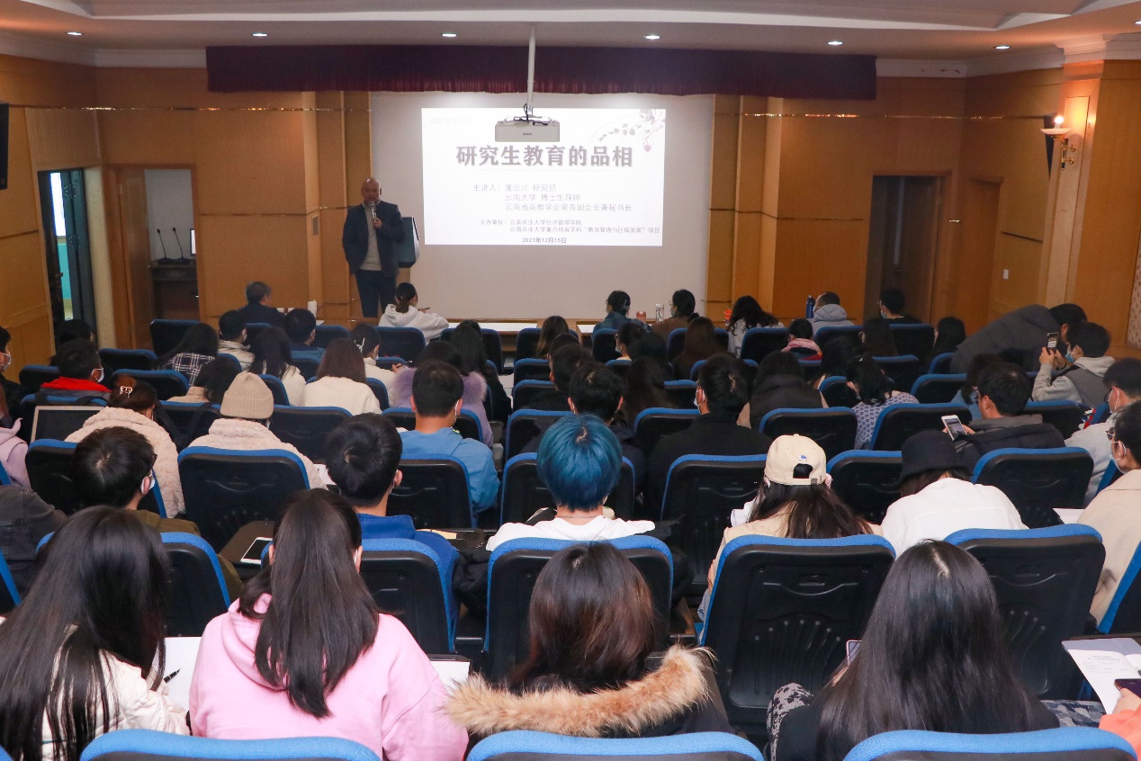 2021年12月15日上午,云南大学博士生导师、云南省高教学会常务副会长兼秘书长董云川研究员受邀来到世界杯官方网站入口2026进行题为“研究生教育的品相”的学术报告。报告会在明理楼6楼报告厅举行,本次报告会由教育管理与区域发展硕士点点长田东林教授主持。公司80余名研究生到场聆听。
