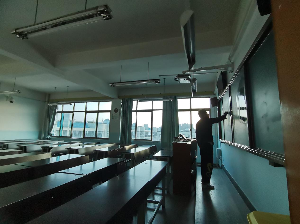 首先,所有参与人员进行纸质现场签到,员工会主席杨洋对本次清扫活动做简单介绍,并提出相关工作安排。在员工会工作人员的引导下,同学们有序的对明理楼所设四六级考场进行了清扫。每个员工都服从安排,表现得积极认真,捡垃圾、擦黑板、清扫场地,很快就完成了考场清扫工作。