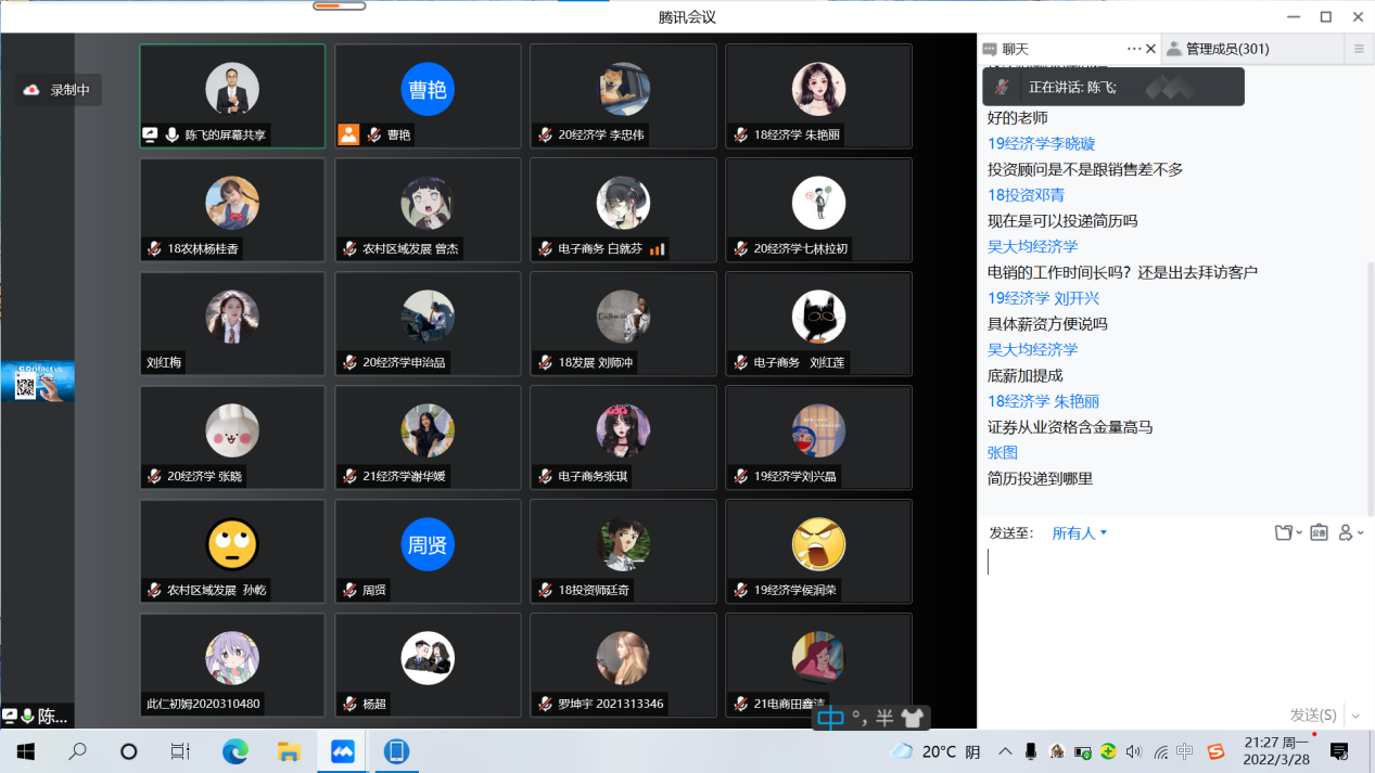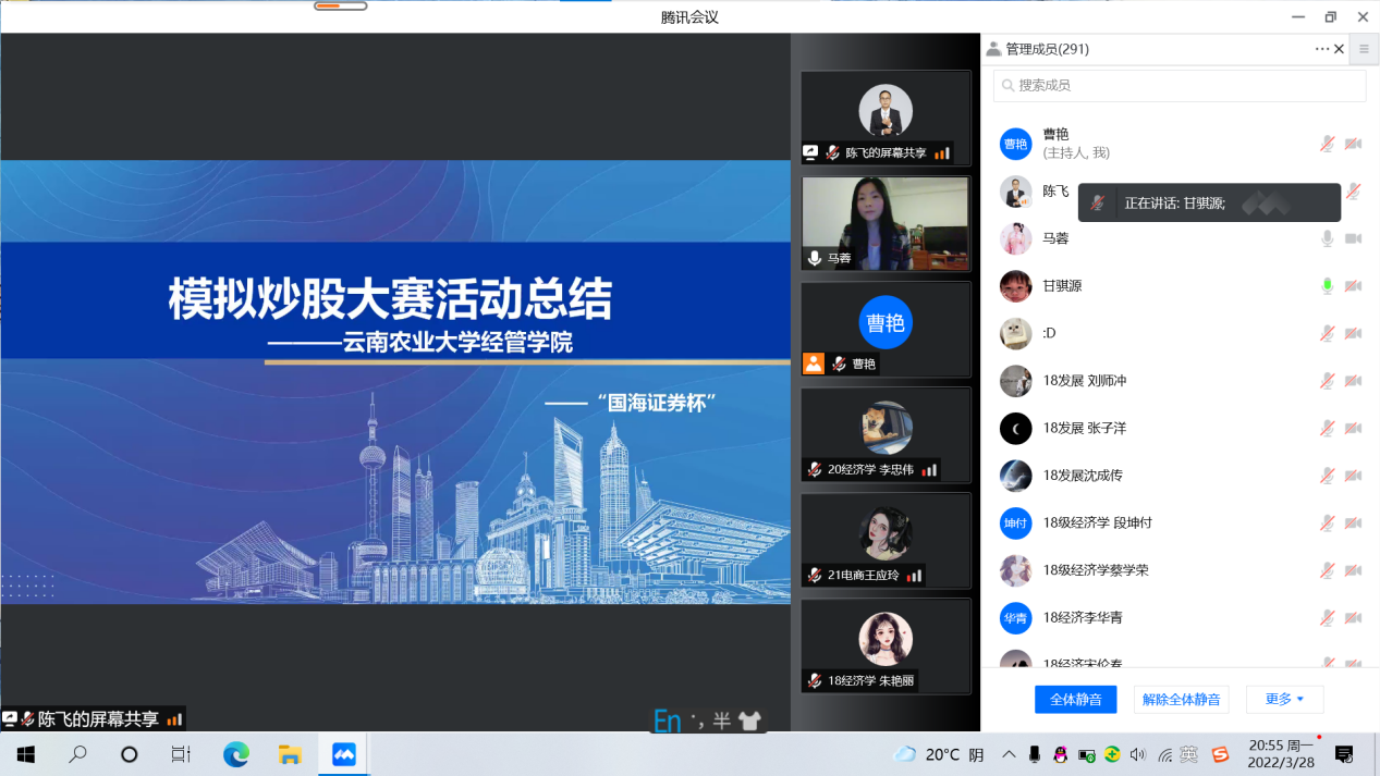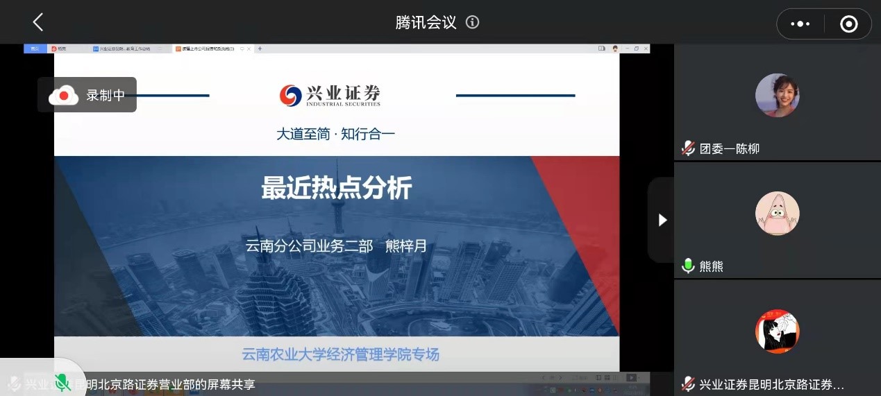 为了让同学们在专业实践中受教育、长才干,世界杯官方网站入口2026联合国海证券公司、兴业证券公司举办模拟炒股大赛,比赛从2021年10月到2022年3月,通过长达5个月的实训,为同学们搭建了一个学习专业知识和实训的桥梁,为今后进入实盘打下坚实基础。3月28日及3月30日,通过线上会议方式宣布本次实训圆满的落幕。出席仪式的有公司党委副书记马蓉、投资系主任李永前、世界杯官方网站入口2026团委老师以及证券公司的经理。
