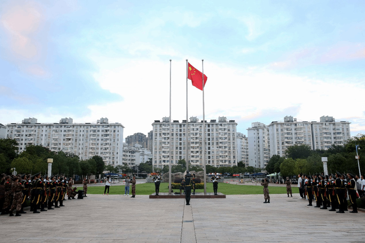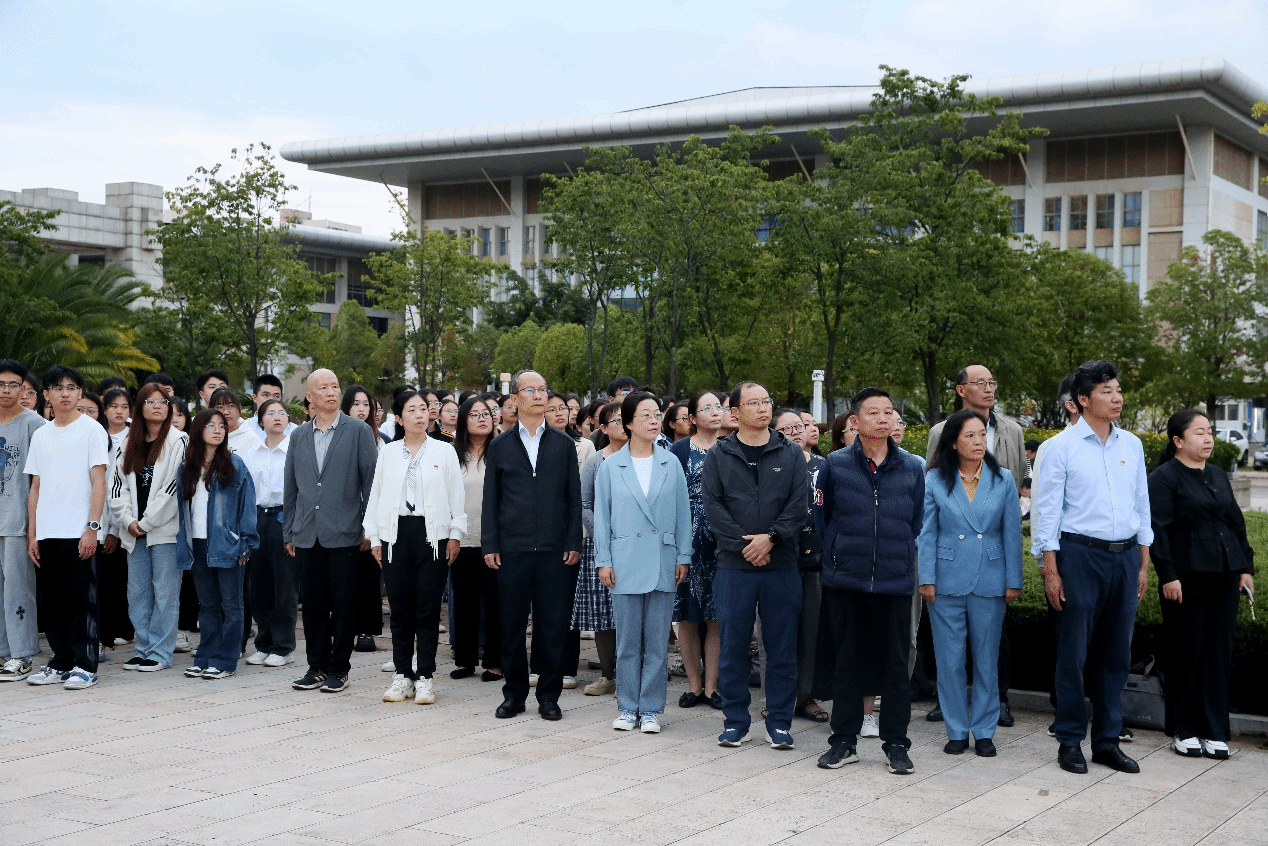 升旗仪式开始,国旗护卫队踏着稳健的步伐,护卫国旗向旗杆走去。《义勇军进行曲》响彻云霄,鲜艳的五星红旗缓缓升起。在晨光中,参加活动的全体师生,在国旗下集合,庄严肃立,向国旗致敬,齐声高唱国歌,表达对伟大祖国的无限热爱。国旗随后被缓缓降为半旗,师生们向为民族独立和人民解放事业而献出生命的先辈们默哀,表达对他们的深切缅怀和敬意。