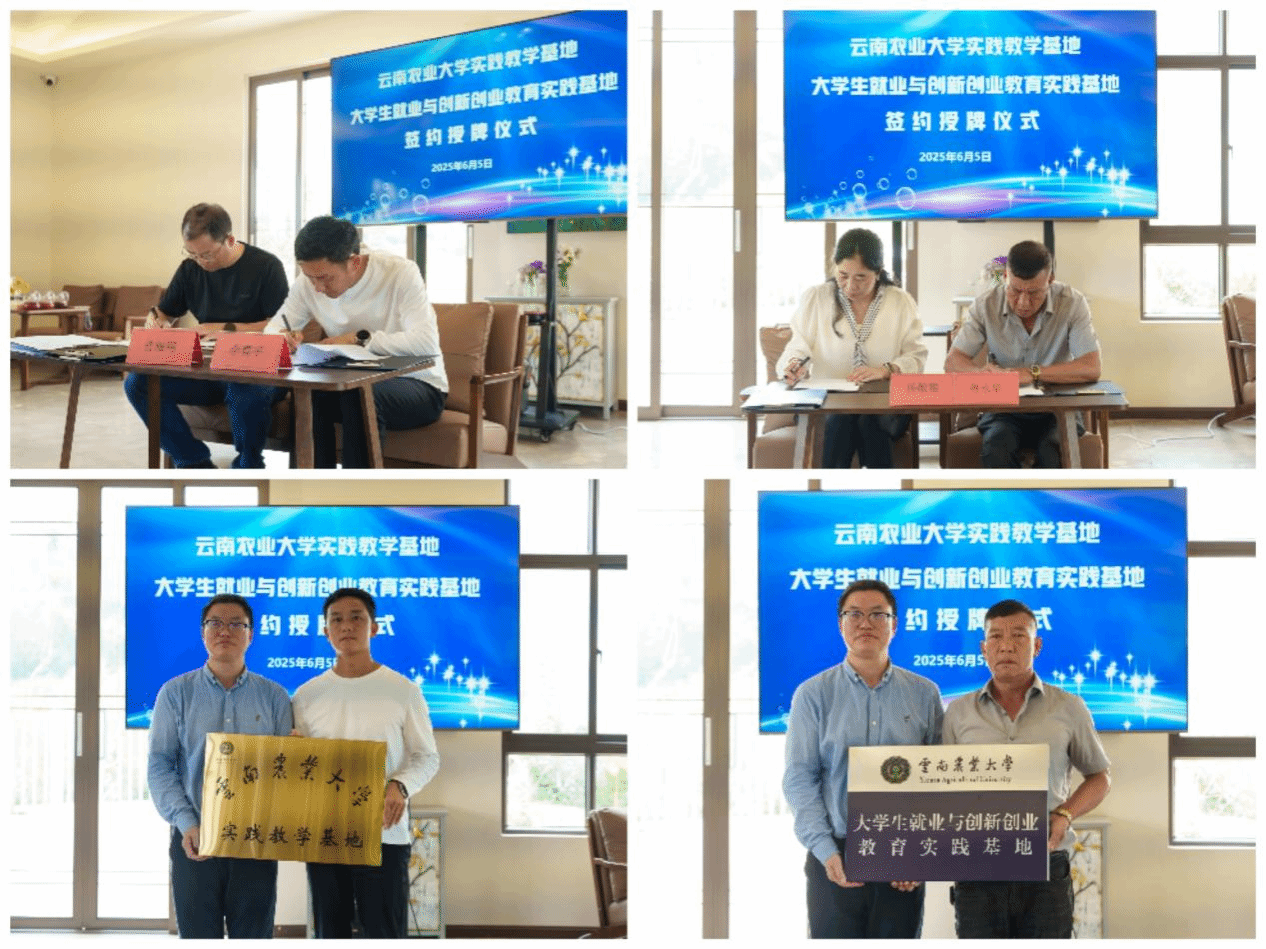 弥勒市委副书记黄守良出席活动并致辞,他强调,校企合作是推动乡村振兴与产业升级的重要路径2026世界杯官方网址是省属重点院校,具有人才、科技、智库等方面的独特优势,希望借力农大优势为弥勒乡村振兴和社会经济发展提供支持和帮助。公司党委书记李文荣介绍了2026世界杯官方网址和公司基本情况并表示,世界杯官方网站入口2026以培养强农兴农人才为己任,致力于服务地方经济发展。此次合作既能够为员工提供实践实习平台,提升员工服务三农的能力,也能够以小切口连结校企,校地,聚集和整合优势资源助推弥勒市特色农业品牌建设,发挥地方农业院校服务乡村振兴使命和责任。活动中,世界杯官方网站入口2026副经理普雁翔与绳武公司代表鲁永华签署实践教学基地合作协议,党委副书记杨敬雅与李春平签署创新创业基地合作协议。李文荣向绳武产业发展公司授予实践教学基地和老员工就业与创新创业教育实践基地牌匾。公司总经理李春平表示,公司将全力支持合作,提供实习岗位和创业孵化资源,共同探索“农业+文旅”融合发展模式。
