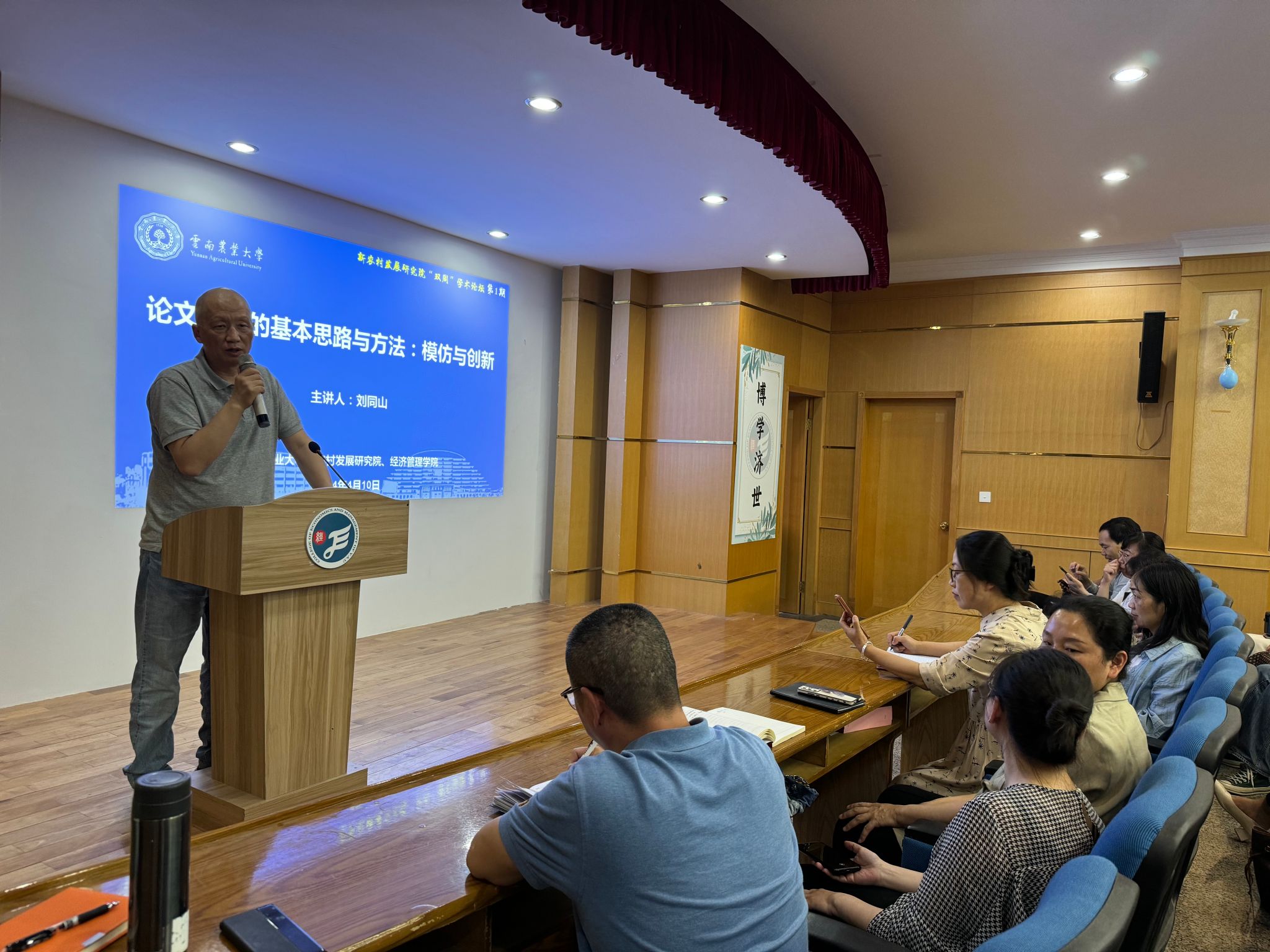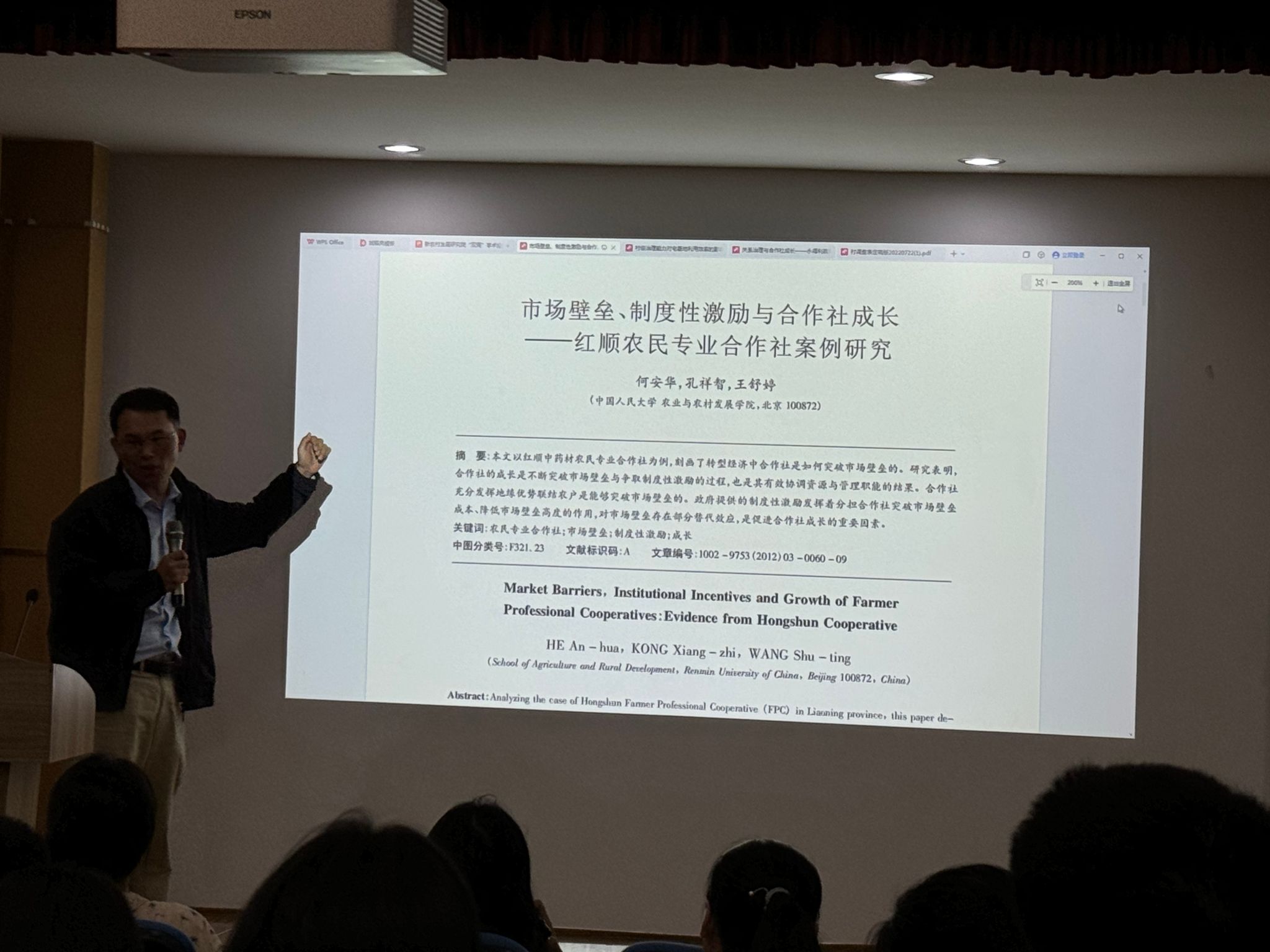 他以自身的经历为个案,向大家阐述了作为某一领域的研究者,必须要懂业务的重要性。他说,无论是社会科学研究,还是自然科学研究,都需要求真务实。他以《市场壁垒、制度性激励与合作社成长——红顺农民专业合作社案例研究》和《关系治理与合作社成长——永得利蔬菜合作社案例研究》两篇论文为例,分析了自己是如何从摘要、引言到合作社的成长历程、成长路径、社会基础、组织保障等方面进行模仿并成功走向创新的。随着刘老师耐心地解说,大家豁然开朗,受益颇多。