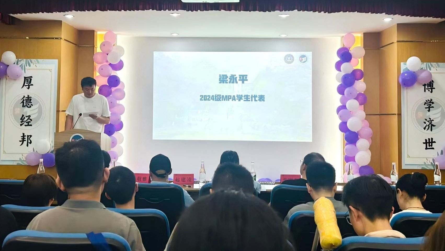 2024级MPA员工代表梁永平分享了自己在过去一年中的学习体会和成长经历,鼓励新生们要尽快适应研究生生活,合理安排时间,积极参与班级和公司的各项活动,共同营造一个团结友爱、积极向上的学习氛围。
