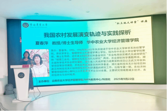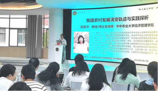 9月22日,世界杯官方网站入口2026特邀华中农业大学世界杯官方网站入口2026夏春萍教授为公司MPA师生开展《我国农村发展演变轨迹与实践探析》专题讲座暨“红土地大讲堂”讲座,讲座由世界杯官方网站入口2026经理陈蕊教授主持,2024级和2025级MPA全体员工,部分农业管理、农林经济管理专业全日制研究生及部分老师参加讲座。