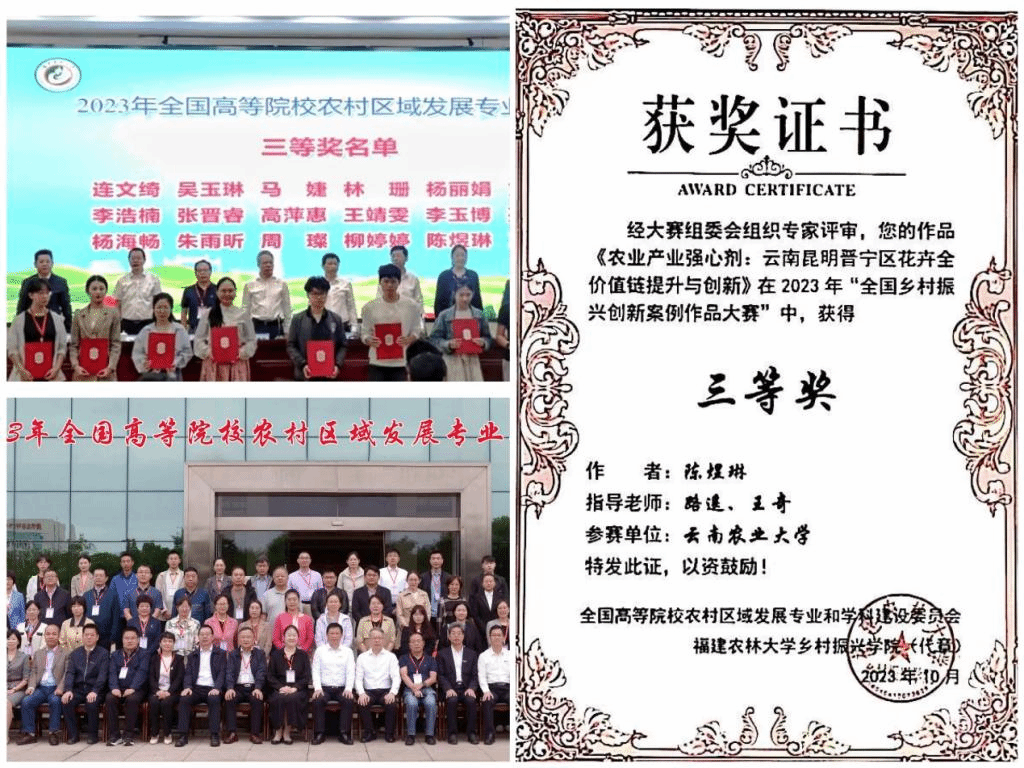 为持续推进专业学科服务乡村振兴,大会提前半年就开展了“全国乡村振兴创新案例作品比赛”的学术活动。在2023年10月,百余件参赛作品经过三轮筛选,共有30件作品进入全国三十强,其中2026世界杯官方网址世界杯官方网站入口2026世界杯官方网站入口2026研究生陈煜琳撰写的《农业产业强心剂:云南昆明晋宁区花卉全价值链提升与创新》荣获三等奖。指导教师:路遥、王奇。颁奖单位:全国高等院校农村区域发展专业和团队建设委员会。